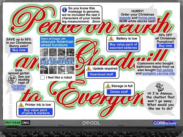 Although I didn't realise it during the creative phase, I now think that clutter of notification bubbles on a laptop screen is an allegory of the relentless commercial pressures on the consumer at Christmas! Both divert the attention away from something much deeper and more important: with so much hate-fuelled conflict and aggressive posturing going on around the world, the Peace and Goodwill message is surely more relevant now than ever before.